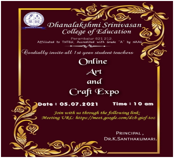 Art exhibition has been conducted On October 4, 2021 by Dhanalakshmi Srinivasan College of Education in perambalur. Student teacher’s has created many kinds of art thinks as well as display in class room. The principal, our college faculty have gone to visit it for learn new information from exhibition. "An art exhibition can connect forms visually, showing contrast, difference, indifference, agreement between objects.